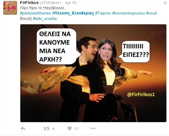 Την ώρα που η Ζωή Κωνσταντοπούλου παρουσιάζει το πολιτικό της κόμμα στο Χυτήριο το Twitter «γλεντά» με την «Πλεύση Ελευθερίας» και οι ατάκες πέφτουν βροχή. «Ανήμερα της επετείου του Τιτανικού να ονομάσεις το κόμμα